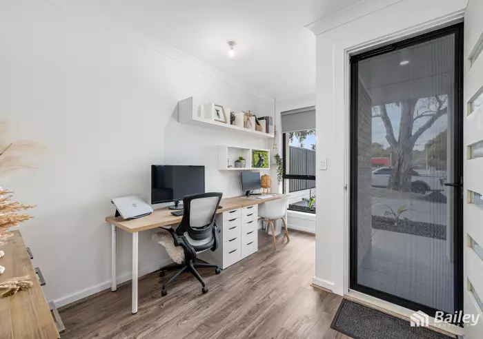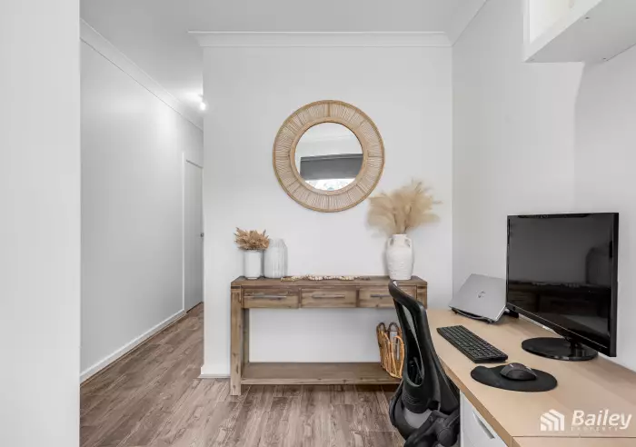 Upon entry, the home exudes style with a crisp neutral colour palette, paired with timber floors. The entry opens to study space, perfect for those who work from home or afterschool homework.