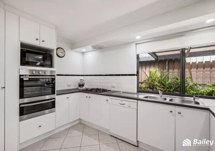 The kitchen is both stylish and practical, offering ample cabinetry, quality appliances and a breakfast bar, ideal for everyday living and entertaining.