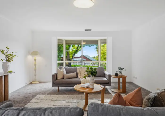 Upon entry, you are welcomed by a formal lounge room featuring a charming bay window. This is an inviting space to relax and unwind with family and friends.
