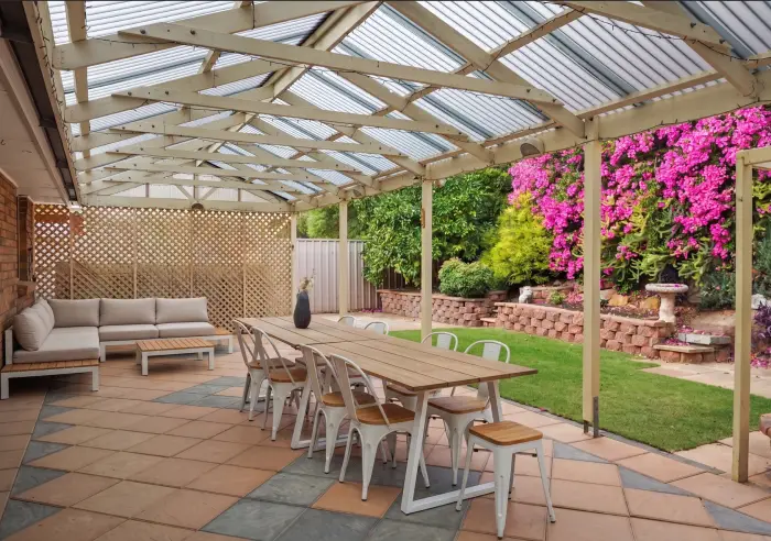 Adjacent, a second living area offers added flexibility and seamlessly connects to the outdoor entertaining space via sliding doors. The impressive pitched-roof pergola creates a true extension of the home-perfect for year-round entertaining with family and friends.